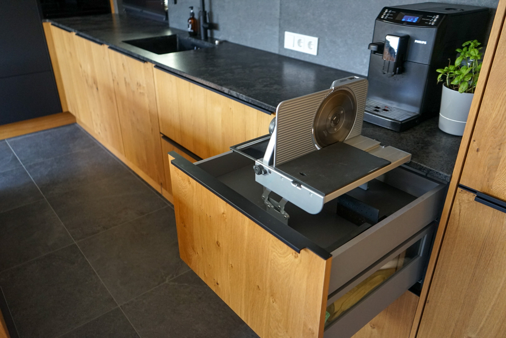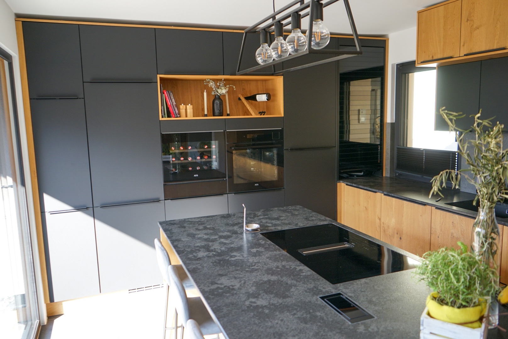 Diese Küchenplanung lässt keine Wünsche offen. Viel Arbeitsplatz durch die schöne Kücheninsel. Versteckt sind die praktischen Dinge wie der Auszug für die Wurstmaschine etc.